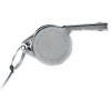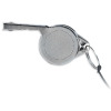 Sifflet en métal attaché à un cordon avec boucle de sécurité.