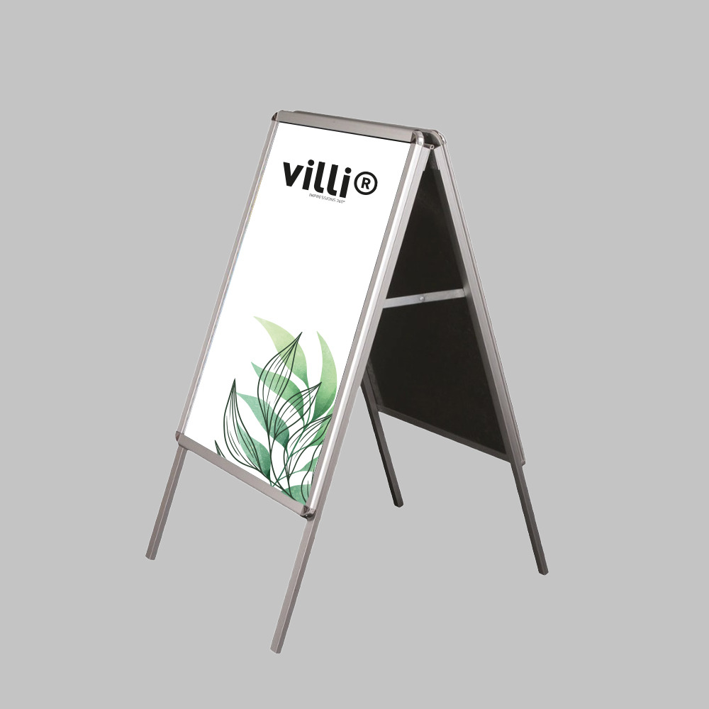 Les affiches se glissent facilement grâce aux cadres clippants frontaux pratiques, et les protections anti-reflet préservent vos visuels de la décoloration tout en assurant une excellente visibilité en plein soleil. Le chevalet se plie entièrement à plat, simplifiant le transport et le rangement.